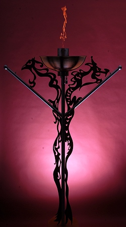 Der Phönix — das Symbol für Erfreuliches. Der Drache, als Beschützer gibt er Geborgenheit. Die Feuerschale, der Energieausstoß, die Krone - der Sockel, die Energiequelle, im Zeichen der vier Elemente Feuer, Erde, Wasser, Luft. Oberflächen-Korrosion der gewünschte Materialeffekt.